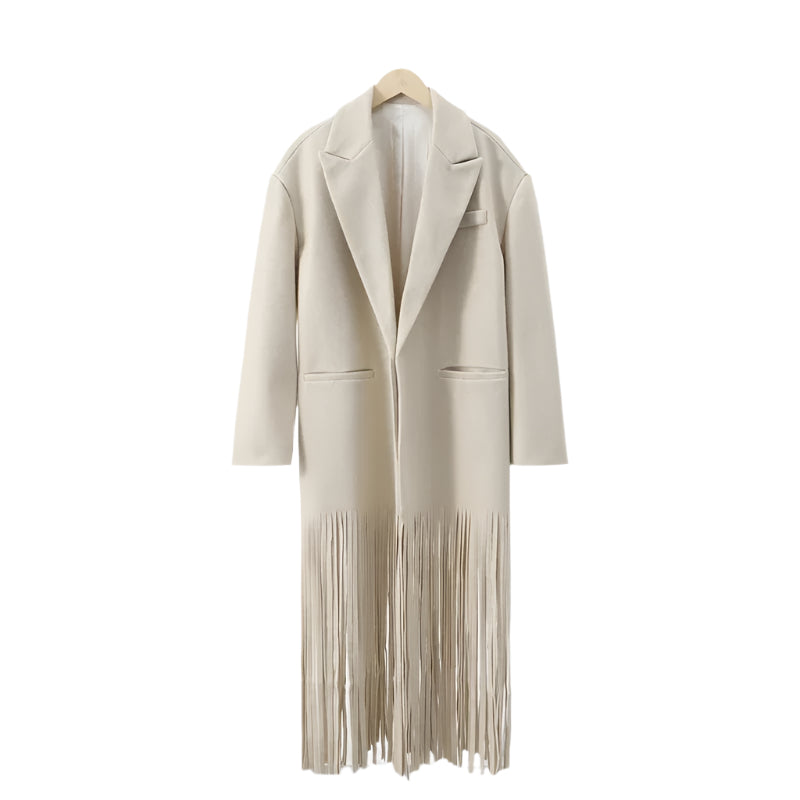 Add a touch of boho-chic style to your wardrobe with this Tassel Hem Women's Coat. Designed to turn heads, this female overcoat combines elegance with playful fringes, making it the perfect statement piece for any season. Featuring a stylish turndown collar and long sleeves, this coat offers both warmth and sophistication while giving off a trendy, laid-back vibe.
